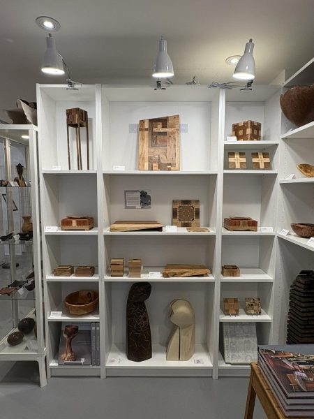 The people’s entrance to the museum immediately drops guests into a gift shop, with wooden earrings, cutting boards of various shapes and sizes, patterned rolling pins with blends of black walnut and white oak wood, sculptures and small furniture for sale.