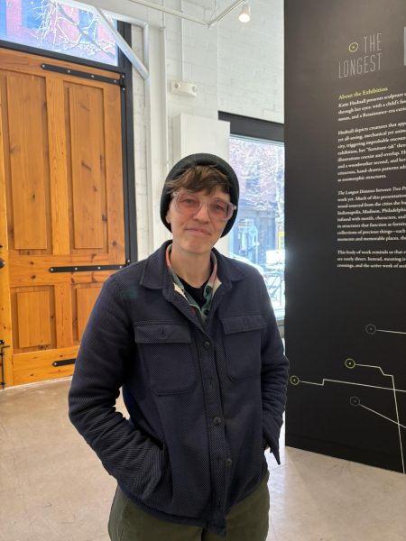 After making my way around the gift shop, I entered the exhibition space. The stairs to the gallery were to the left of the room. Coincidentally, I visited when artist Katie Hudnall, MFA, was setting up her exhibition. Hudnall runs the woodworking and furniture program at the University of Wisconsin-Madison.